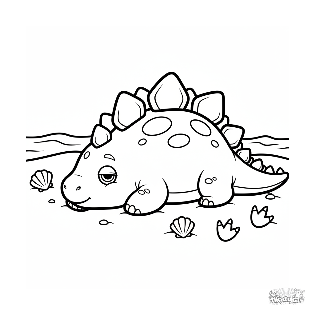 Simple coloring page for toddlers 2-3: a cute stegosaurus rests on a sand dune by an ancient ocean. Large shapes, thick outlines.