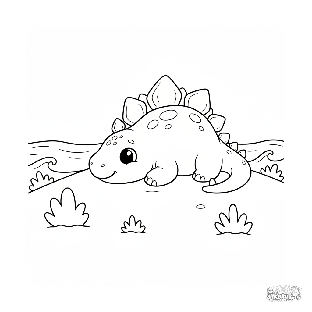 Simple coloring page for toddlers 2-3: a large stegosaurus resting on a sandy dune by an ancient ocean. Big shapes, few details.