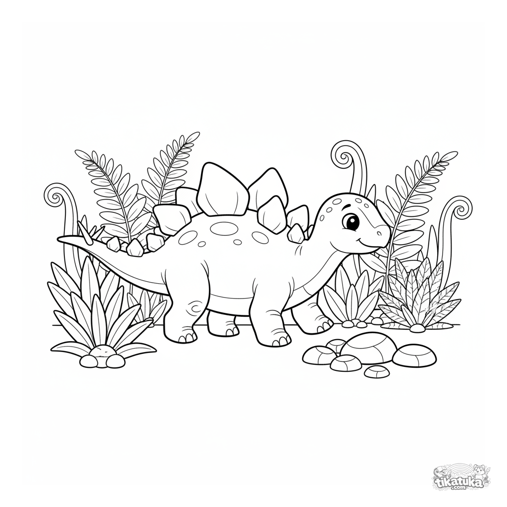 Coloring page for kids 4-6: a friendly stegosaurus with large plates walks among tall ferns in a prehistoric grove.