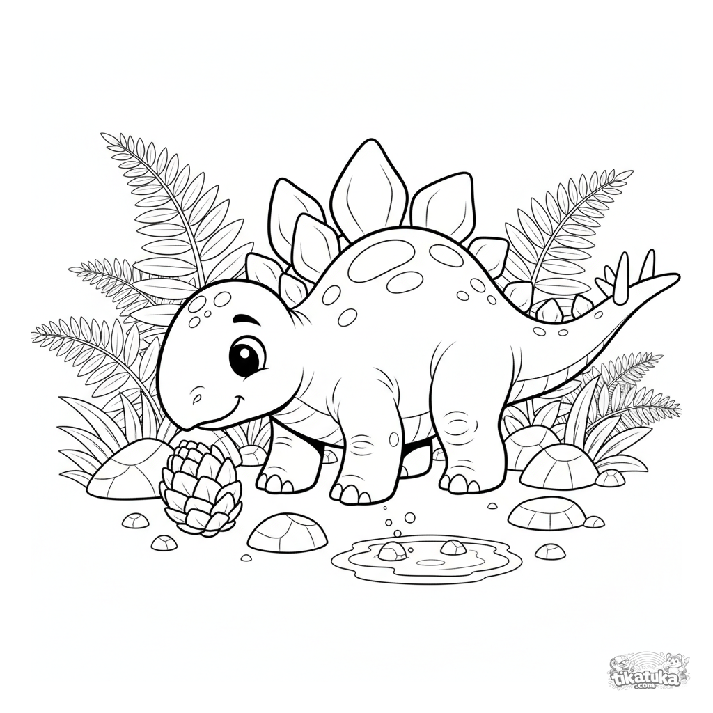 Coloring page for kids 4-6: a friendly stegosaurus with back plates stands in a fern forest, curiously sniffing a large fruit.