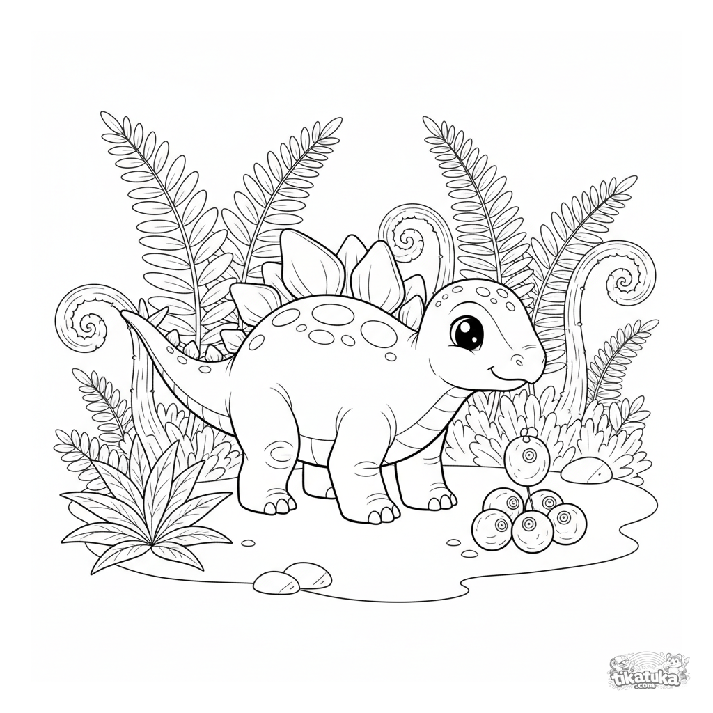 Coloring page for kids 4-6: a friendly stegosaurus with back plates in a prehistoric fern grove, perfect for young artists.