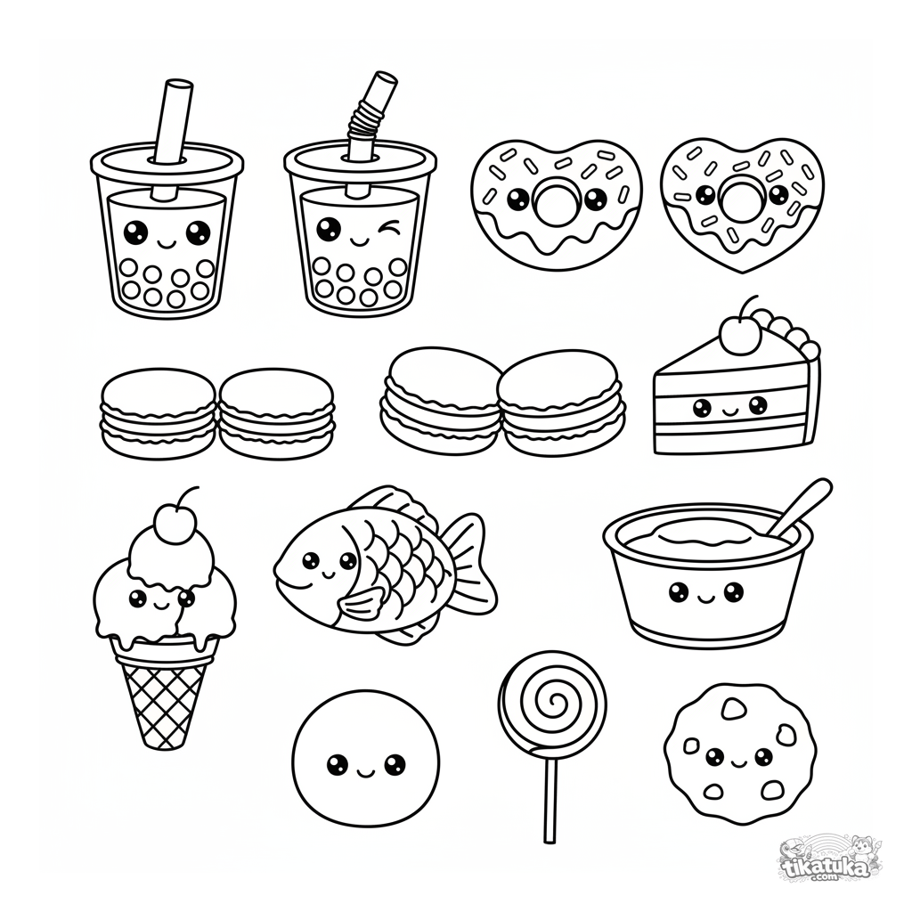 Sticker sheet coloring page for toddlers 2-3: 12 separate cute items - boba drinks, donuts, cakes, and other desserts in kawaii style, ready to color and cut out.