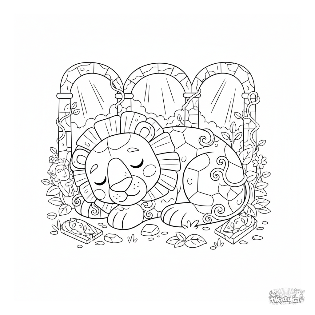 Coloring page for tweens 7-9: a massive stone lion guardian sleeps among overgrown elven ruins. Peaceful, majestic scene in a classic cartoon style, wide margins.