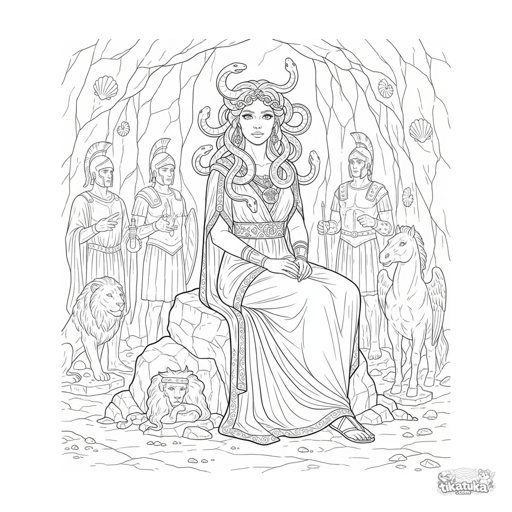 Coloring page: Medusa the Gorgon in her stony lair amidst petrified statues. For kids 10-12 years. Detailed scene of cavern, serpents, and ancient warriors.
