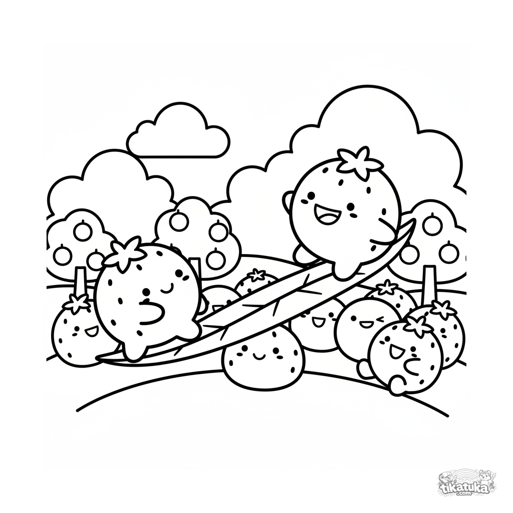 Coloring page of two mochi friends playing on a seesaw. A balanced scene for tweens 7-9, depicting interaction and fun in the mochi field.