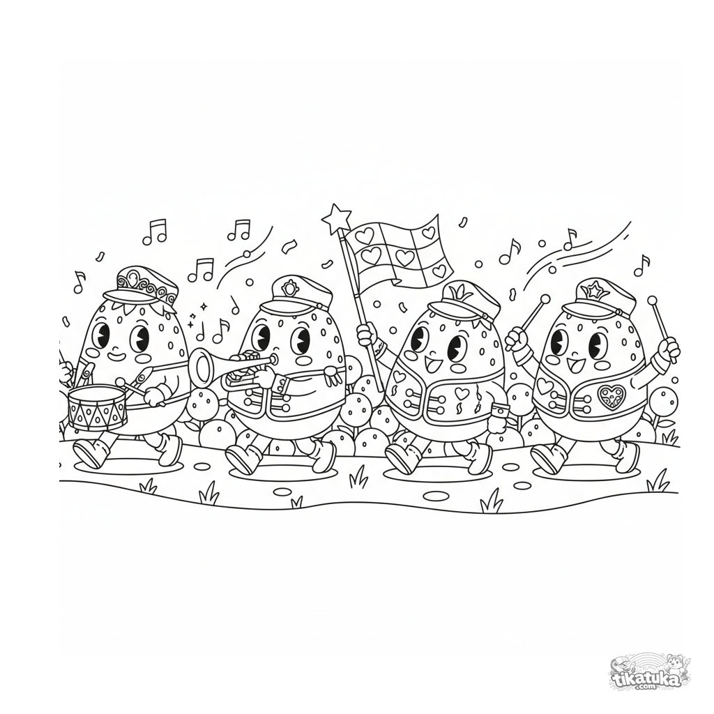Dynamic coloring page of a strawberry mochi marching band parade. A detailed scene for older kids 10-12 with many elements to color.