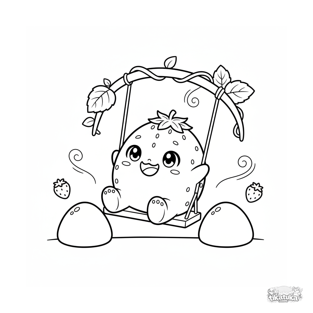 Coloring page of a happy strawberry mochi swinging on a vine. A bright, simple scene for kids 4-6, full of joy and movement.