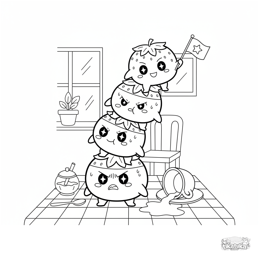 Coloring page of a tower of strawberry mochi balancing on a table. A fun, wobbly scene in a 90s cartoon style for kids aged 4-6. Color this precarious dessert construction!