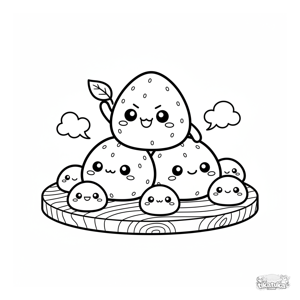 Coloring page of three strawberry mochi balancing on each other among other sweets. A cute scene for kids ages 4-6, developing motor skills and imagination.