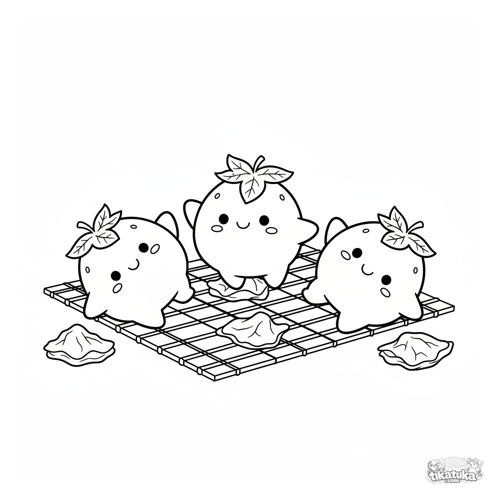 Coloring page with three cute strawberry mochi balancing on a mat. Kawaii style for kids 4-6. Free printable.