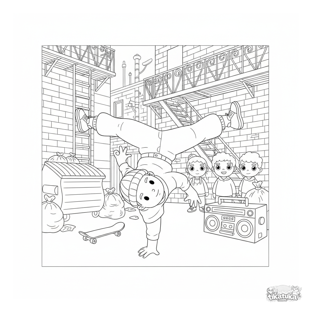 Detailed coloring page: a street dancer performs a breakdance move in a city alley with brick walls and friends in the background. For kids 7-12 who love dynamic scenes.