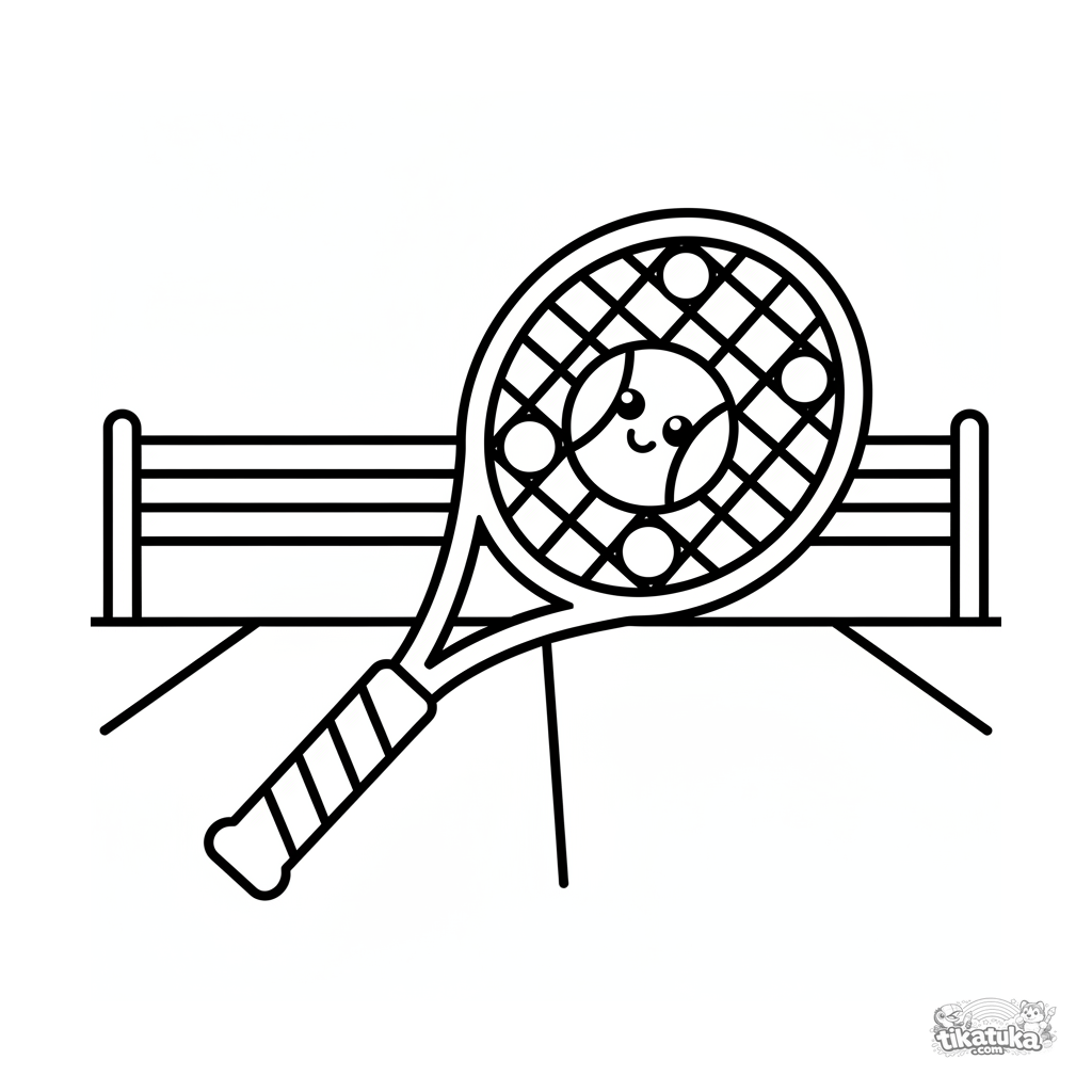 Very simple coloring page for toddlers 2-3: a large stylized racket and a smiling ball lie on the lines of a tennis court. Bold thick outlines.