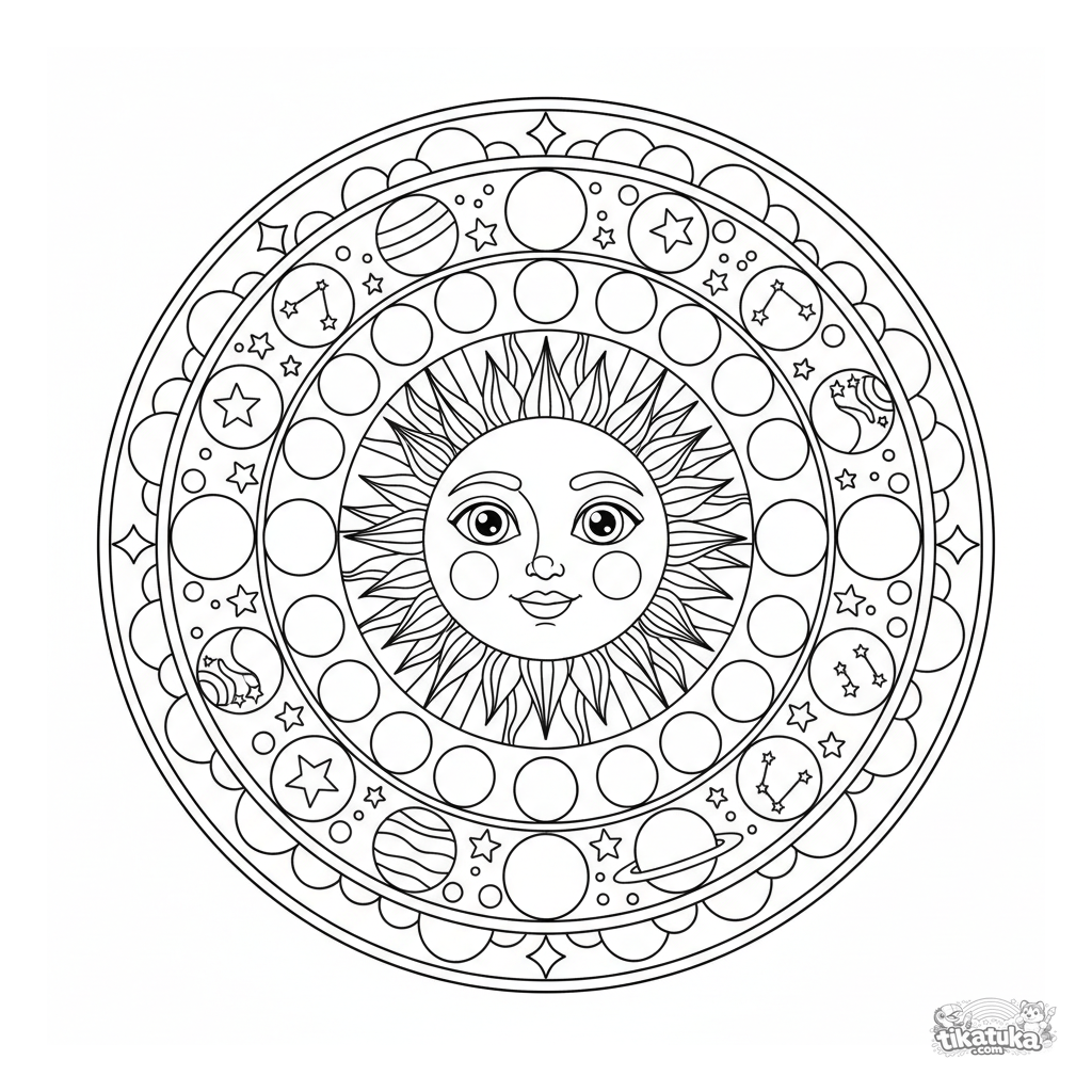 Detailed celestial Sun and Moon mandala coloring page for ages 10-12. Sun face, moon phases, ring of stars and constellations, four-fold symmetry.