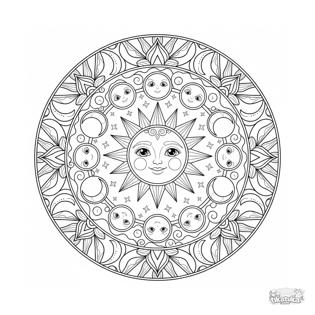 Detailed celestial sun and moon mandala coloring page for ages 10-12. Center sun with rays, ring of moon phases, clouds and stars. Rich symbolism.
