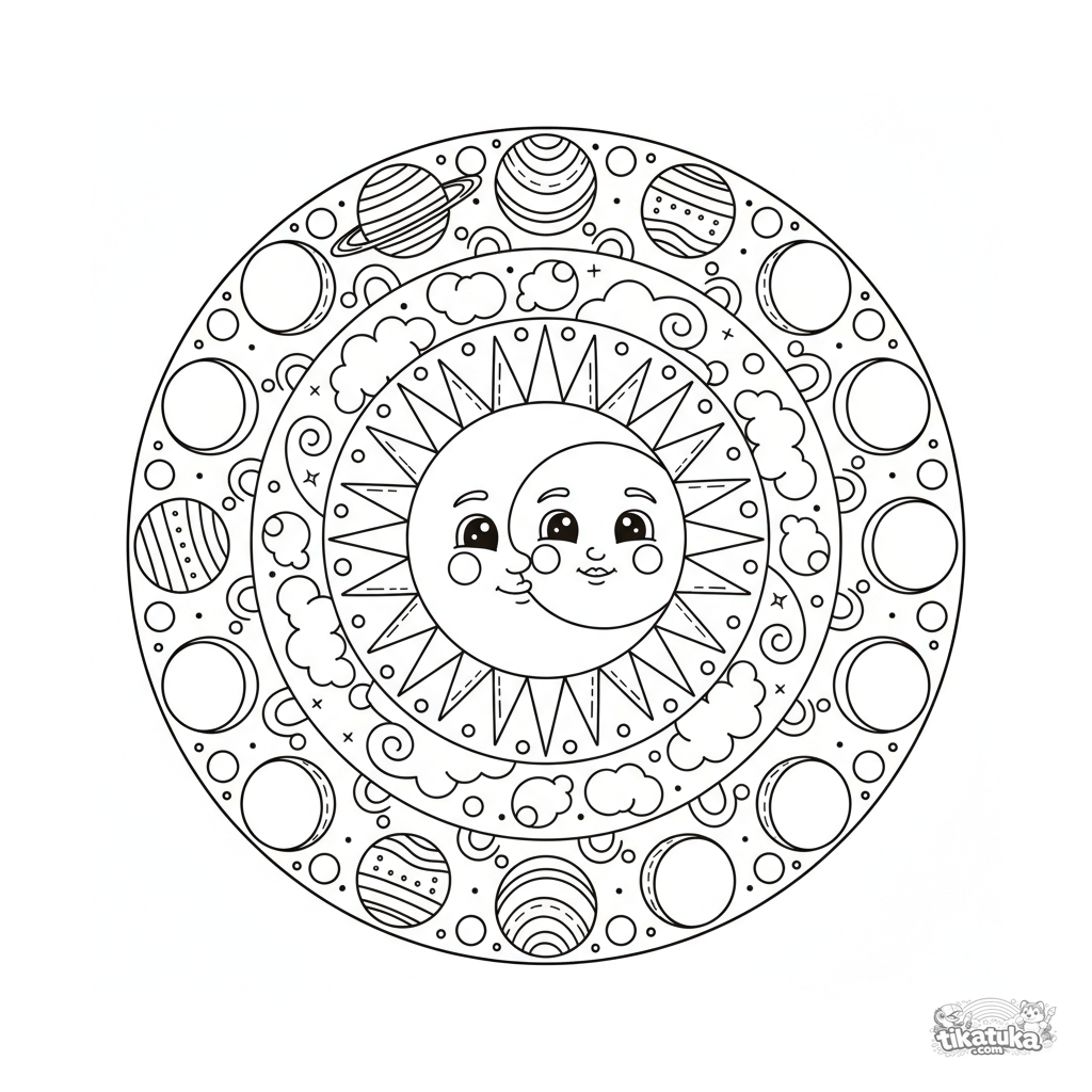 Detailed celestial mandala coloring page for ages 10-12. Sun and moon center, rings of rays, clouds, stars, planets, and moon phases on cosmic background.
