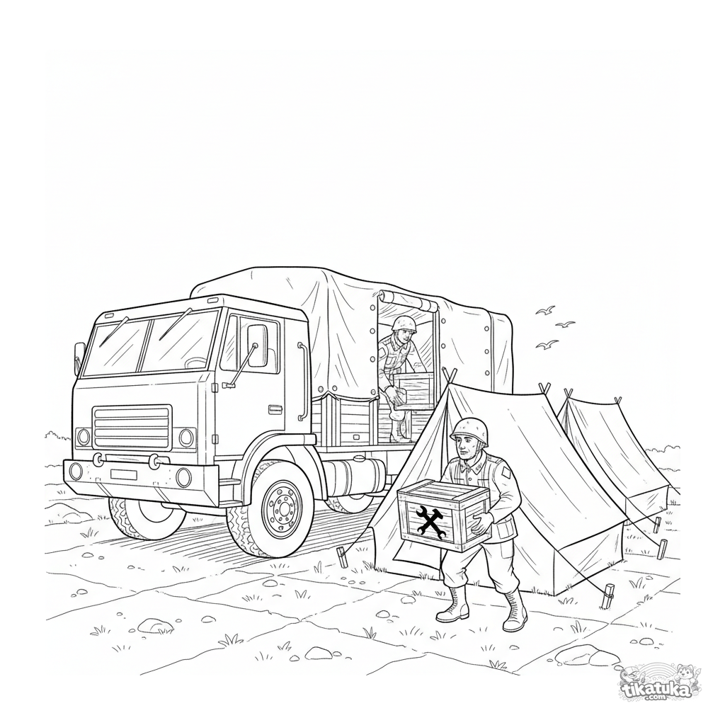 Detailed coloring page for ages 10-12: a military supply truck unloading at a field headquarters. Soldiers pass a crate. Clear outlines and interesting details.