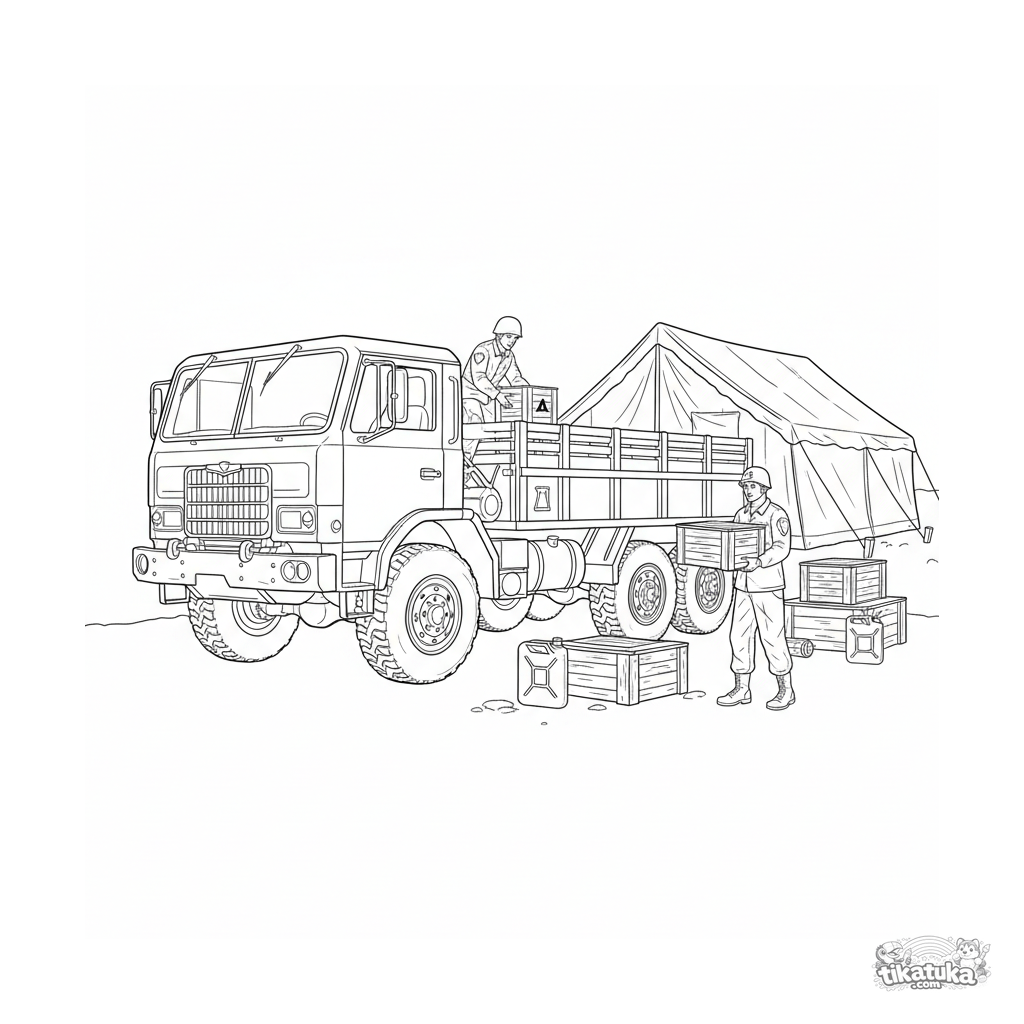 Coloring page of a military truck unloading supplies at a field HQ. For older kids 10-12. Detailed illustration of the vehicle, crates, tents, and soldiers.