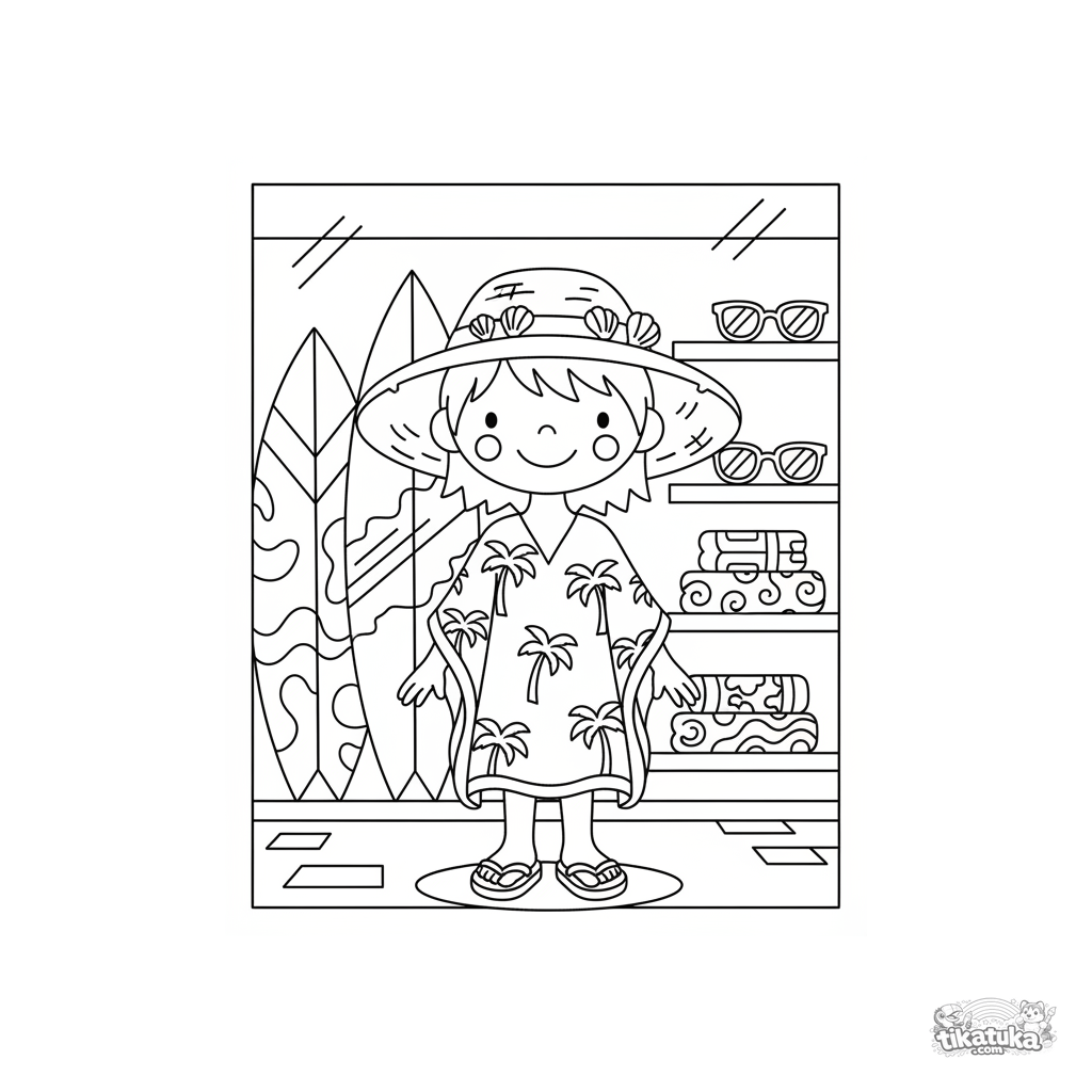 Coloring page for girls 10-12: a cheerful mannequin in a surf shop window displays a full beach outfit — a kaftan, hat, and flip-flops.