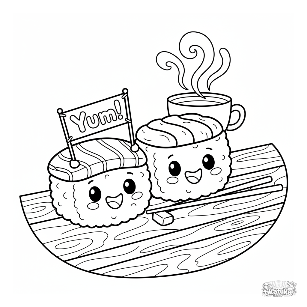 Coloring page of a sushi roll duo celebrating on a cafe counter. For kids 4-6 years old. Features cheerful salmon and avocado rolls holding a 'Yum!' banner.