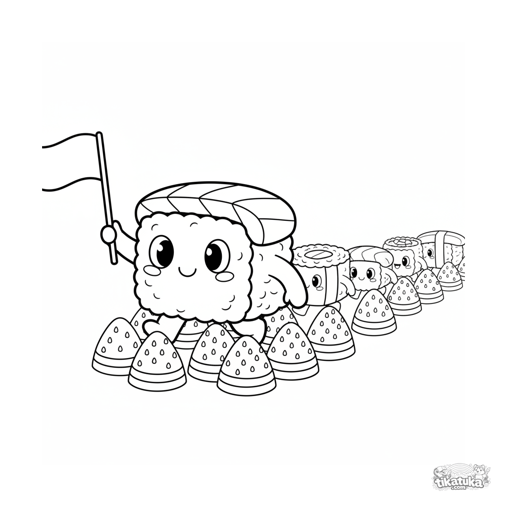 Coloring page for kids 4-6: a happy parade of sushi rolls marches through a strawberry mochi field. A bright and simple scene.