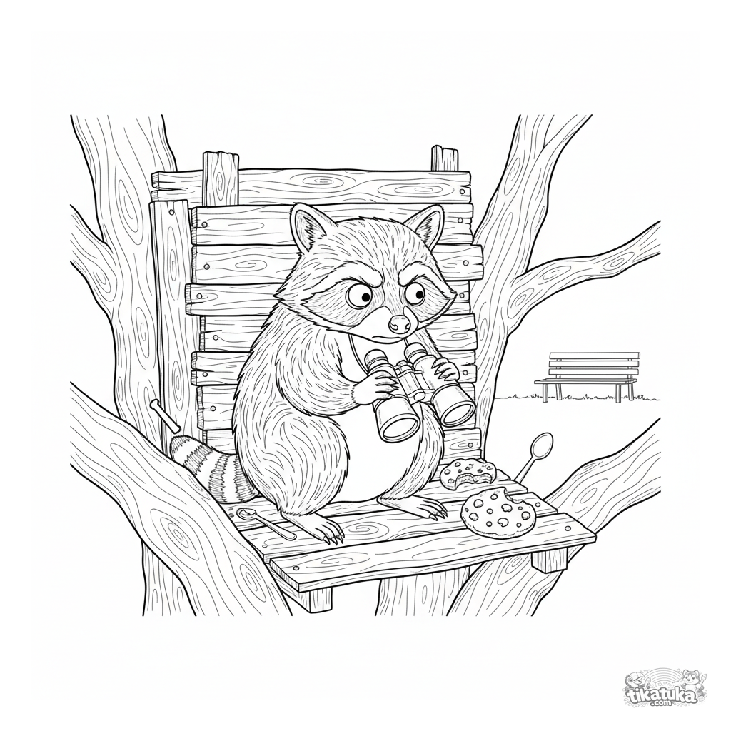 Coloring page for kids 10-12: a suspicious raccoon in a park tree fort spies with binoculars on a bench. Detailed meme with humor and background.