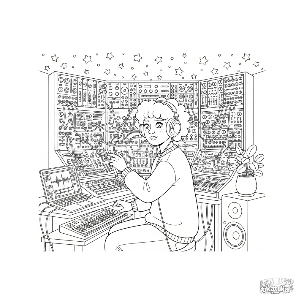 Coloring page for kids 10-12: an electronic music producer making a track in a basement studio. Details: modular synth, patch cables, laptop, glow stars. Realistic field-guide style.