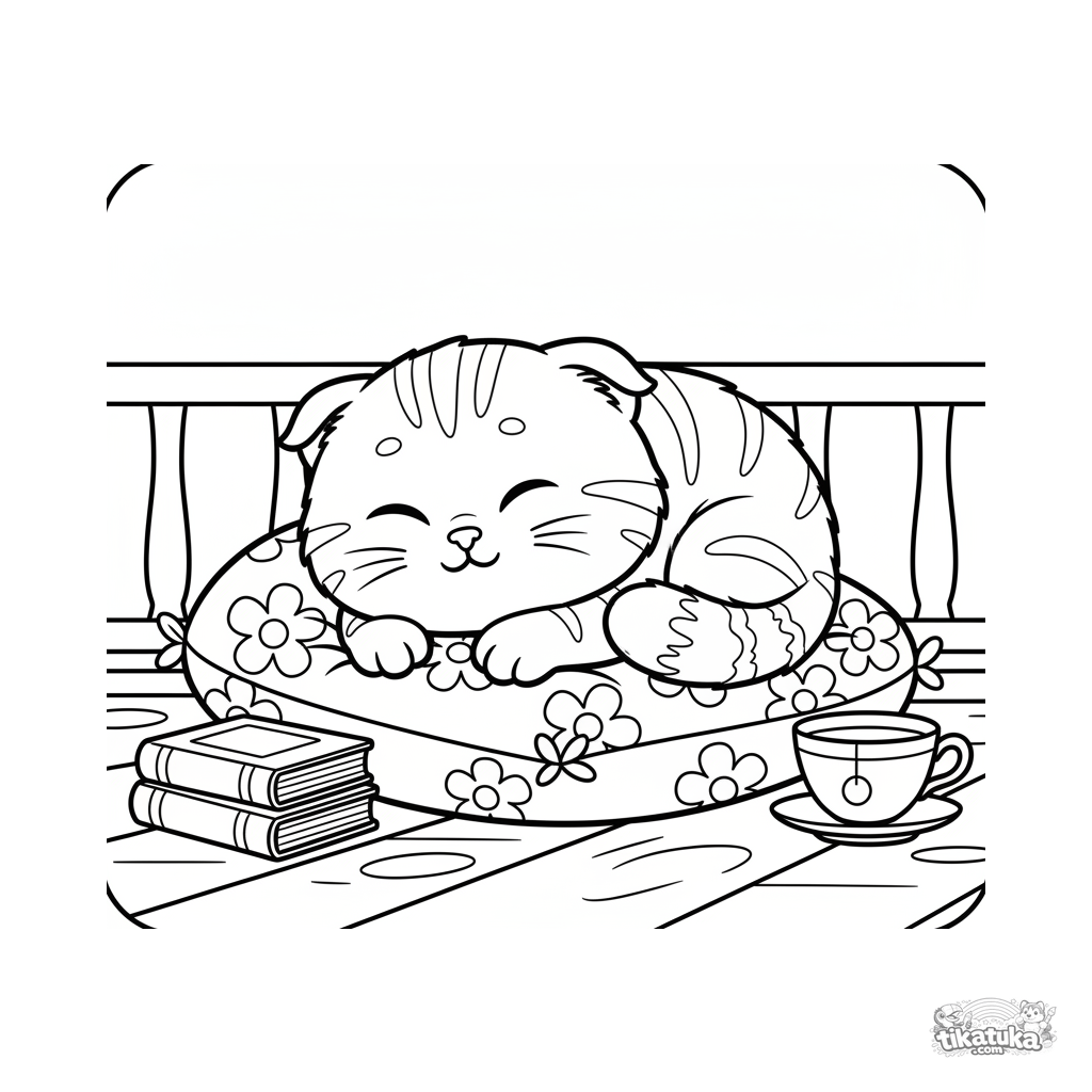 Toddler coloring page: a fluffy kitten naps sweetly on a cushion on a summer veranda. Simple large shapes and wide margins for easy coloring by the youngest artists.