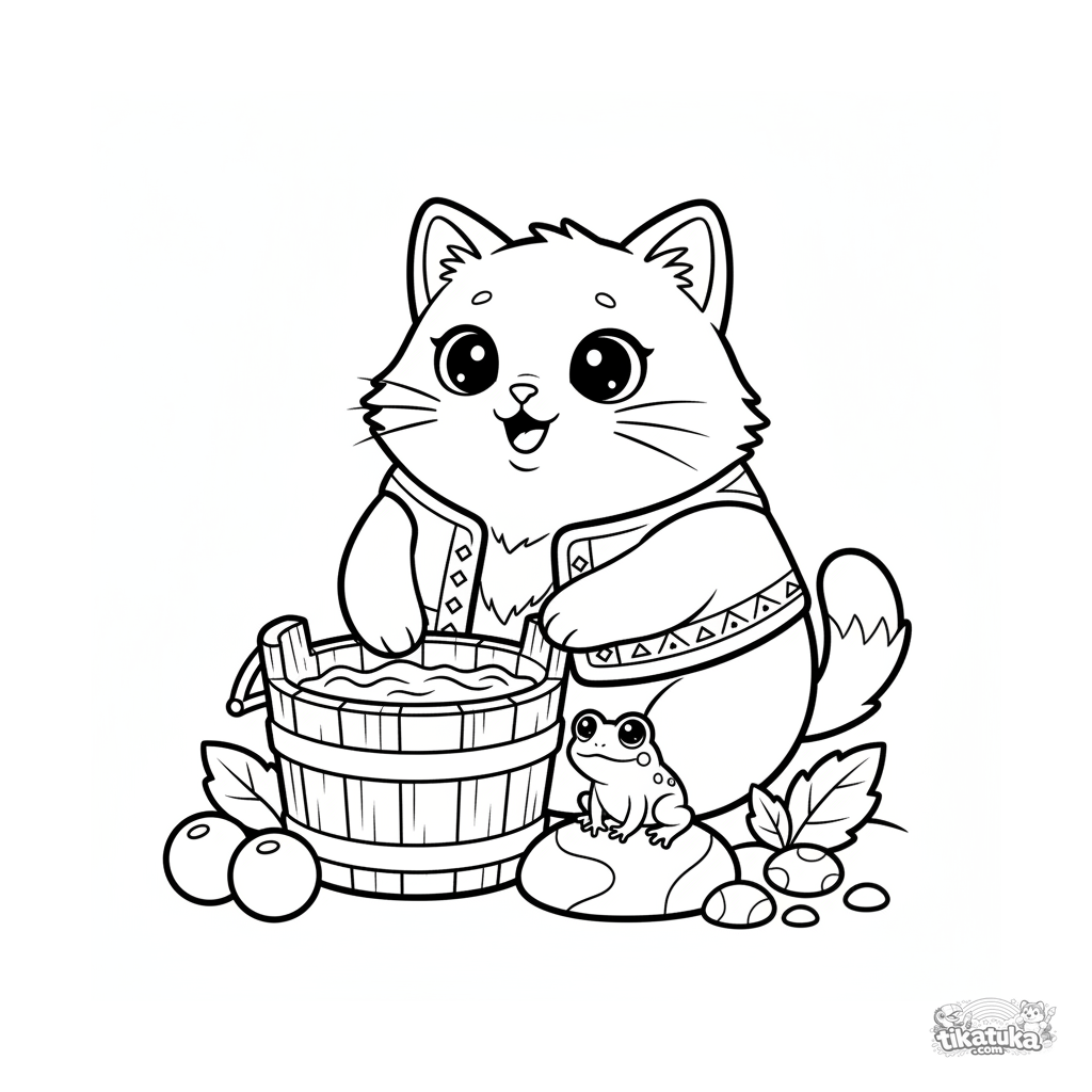 Simple coloring page for toddlers 2-3: a large talking cat in a vest by the well. Huge head, simple shapes, minimal details for easy coloring.