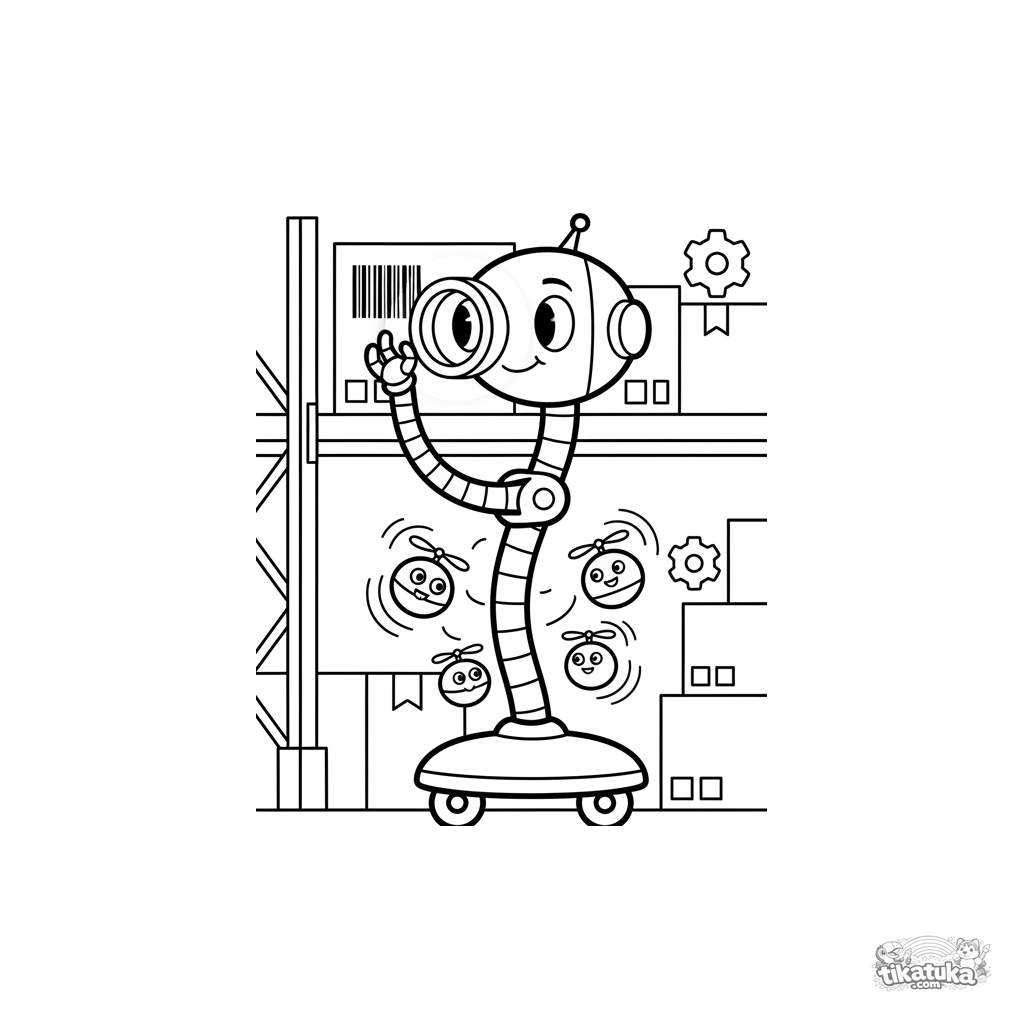 Coloring page in a retro style: a tall wheeled robot scans boxes in a warehouse among drones. For kids 7-9 years old, with flexible, rubbery lines.