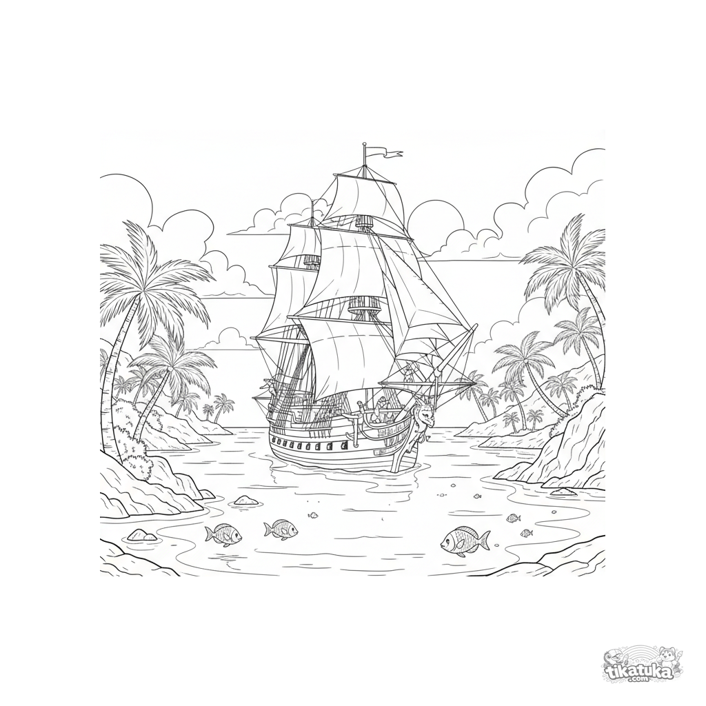 Older kids coloring page for ages 10-12: a detailed three-masted tall ship sails into a clear tropical bay with palm trees. Sailors in rigging, rich arrival scene.