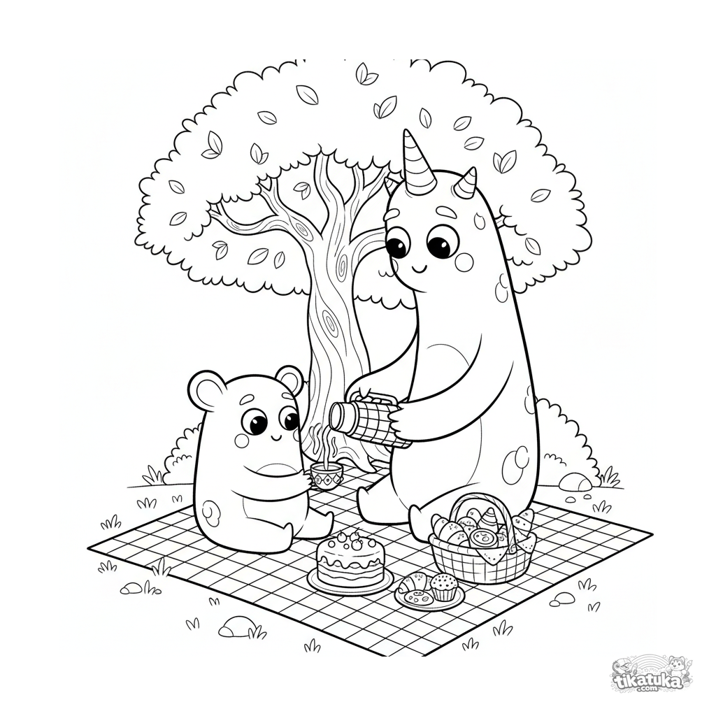 Coloring page for kids 7-9: a tall, friendly monster pouring berry tea at a picnic with monster sweets. A scene of friendship and treats.