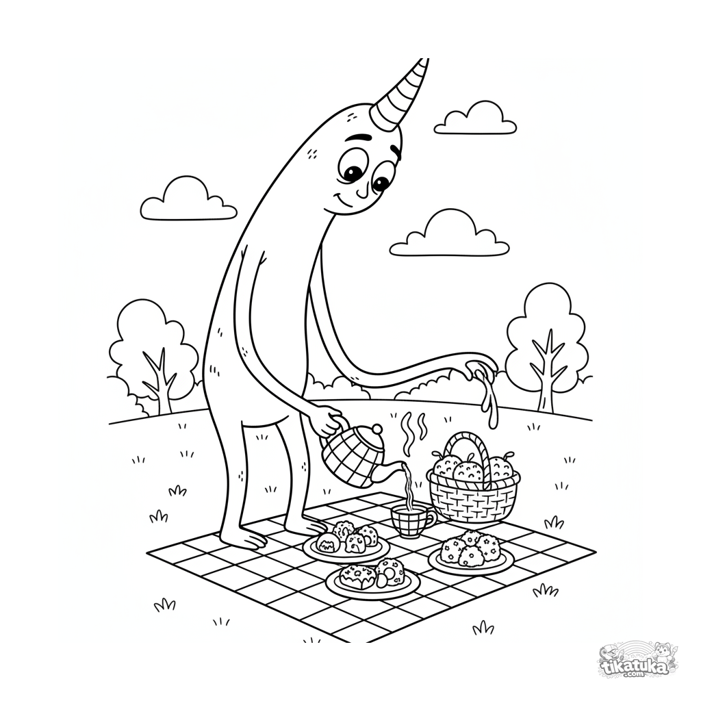 Coloring page of a tall, wobbly monster pouring tea at a picnic with monster sweets. For kids 7-9 years old, sparks imagination and fine motor skills.