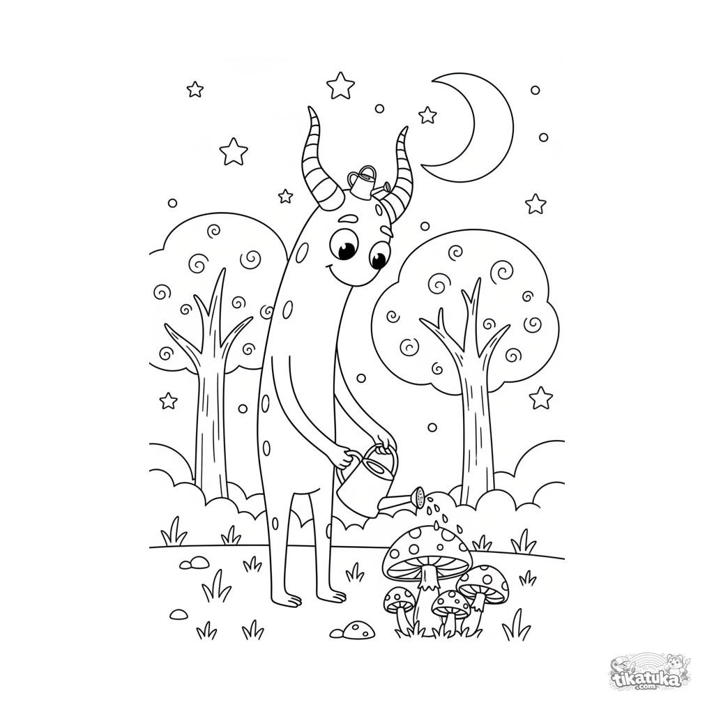 Coloring page for kids 4-6: a tall friendly monster with spiral horns watering glowing mushrooms in a moonlit forest. Simple lines, wide margins for coloring.