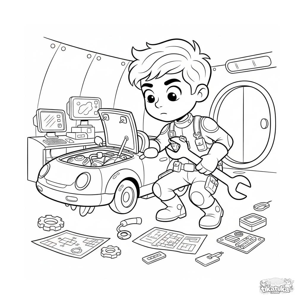 Coloring page of a tech inventor superhero repairing a flying car in an underground laboratory. For kids 7-9, a tech-themed scene with gadgets to color.