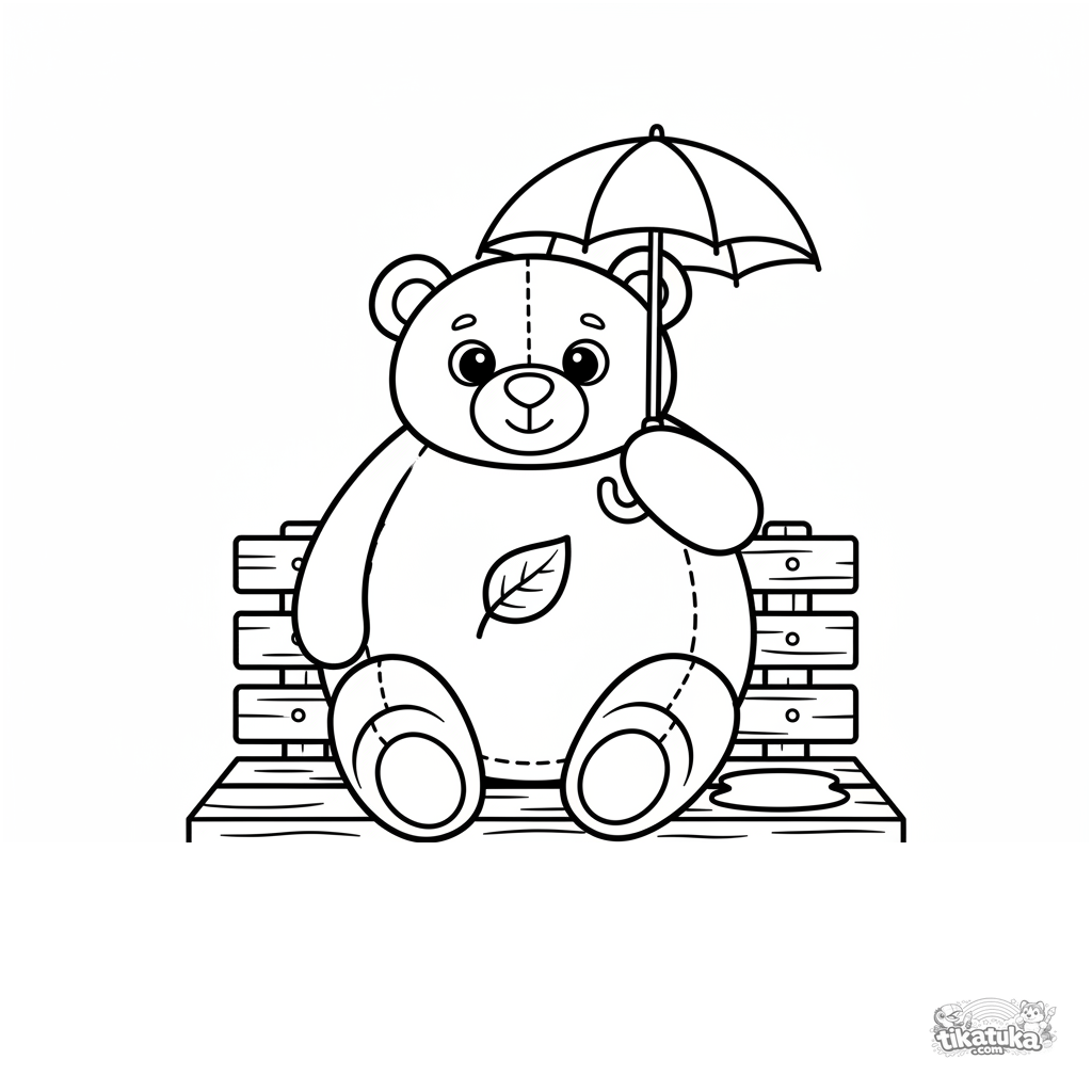 Toddler coloring page for ages 2-3: a large plush teddy bear with an umbrella sits on a wet garden bench in the autumn rain. Very simple, large shapes with huge margins.
