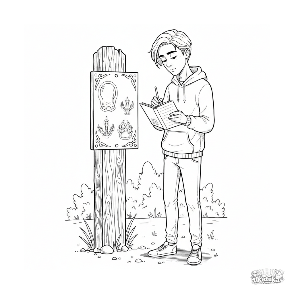 Coloring page for ages 10-12: a teenager compares different animal tracks on a discovery plaque at the zoo. Detailed educational scene about observation and science.