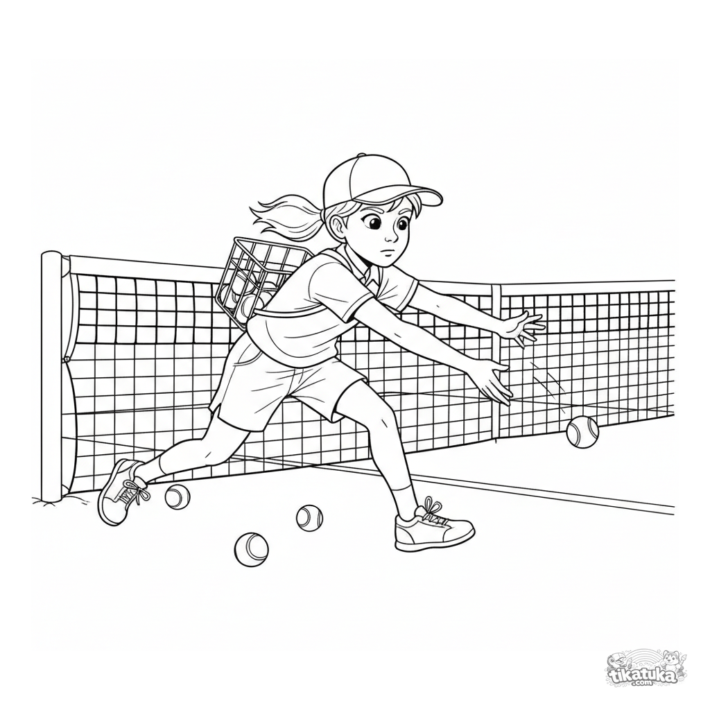 Coloring page for ages 7-9: a ball kid in uniform catches a stray tennis ball near the net. A behind-the-scenes match scene, realistic proportions.