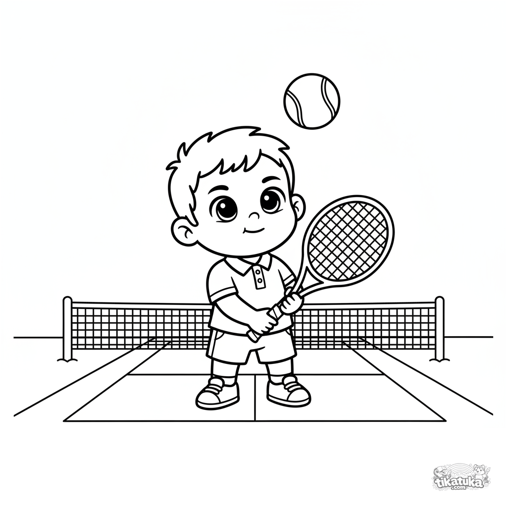 Coloring page for toddlers: a cheerful child on a tennis court prepares to serve a ball. Simple large shapes with wide margins for coloring.