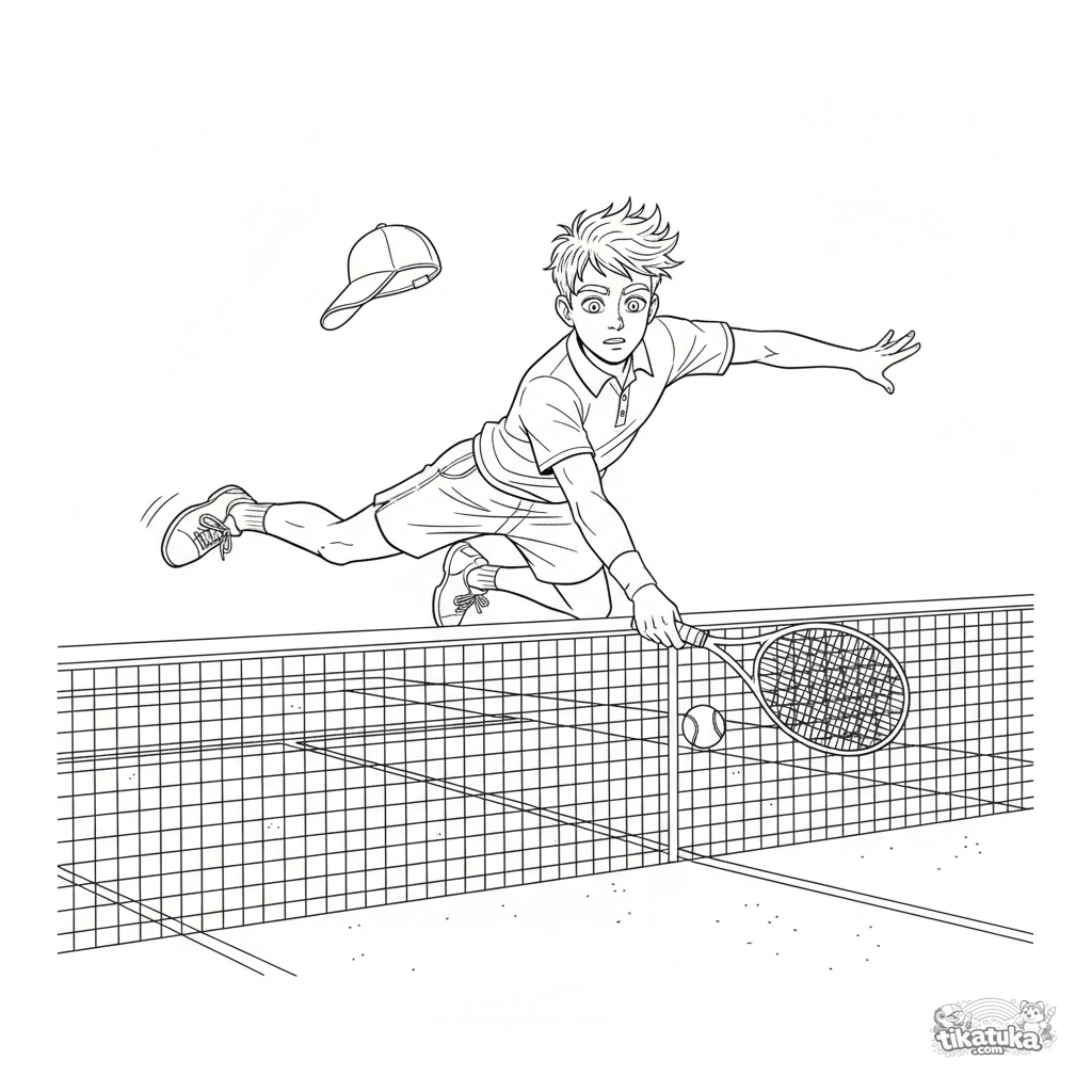 Detailed coloring page for 10-12: a tennis player in a dynamic dive for a drop shot at the net. Detailed anatomy, clay court, for experienced artists.