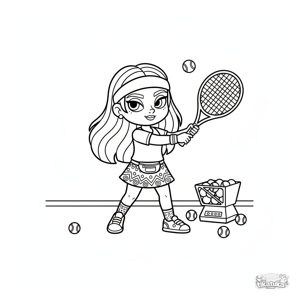 Detailed coloring page for older kids 10-12: a tennis player diligently practices their serve with a ball machine nearby. Solo training scene.