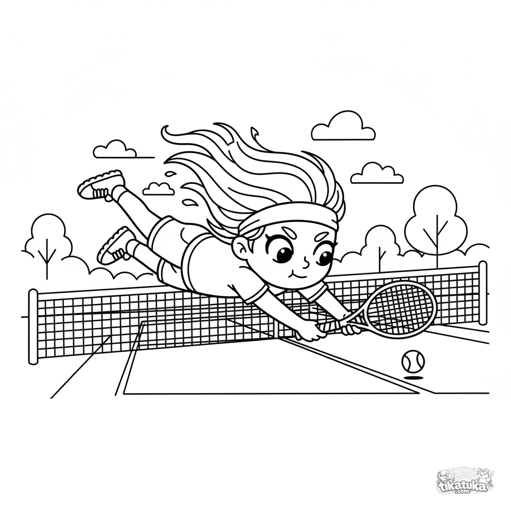 Coloring page for kids 4-6: a tennis player in a dynamic dive reaches for a tricky drop shot at the net. Expressive line of action, energetic pose.