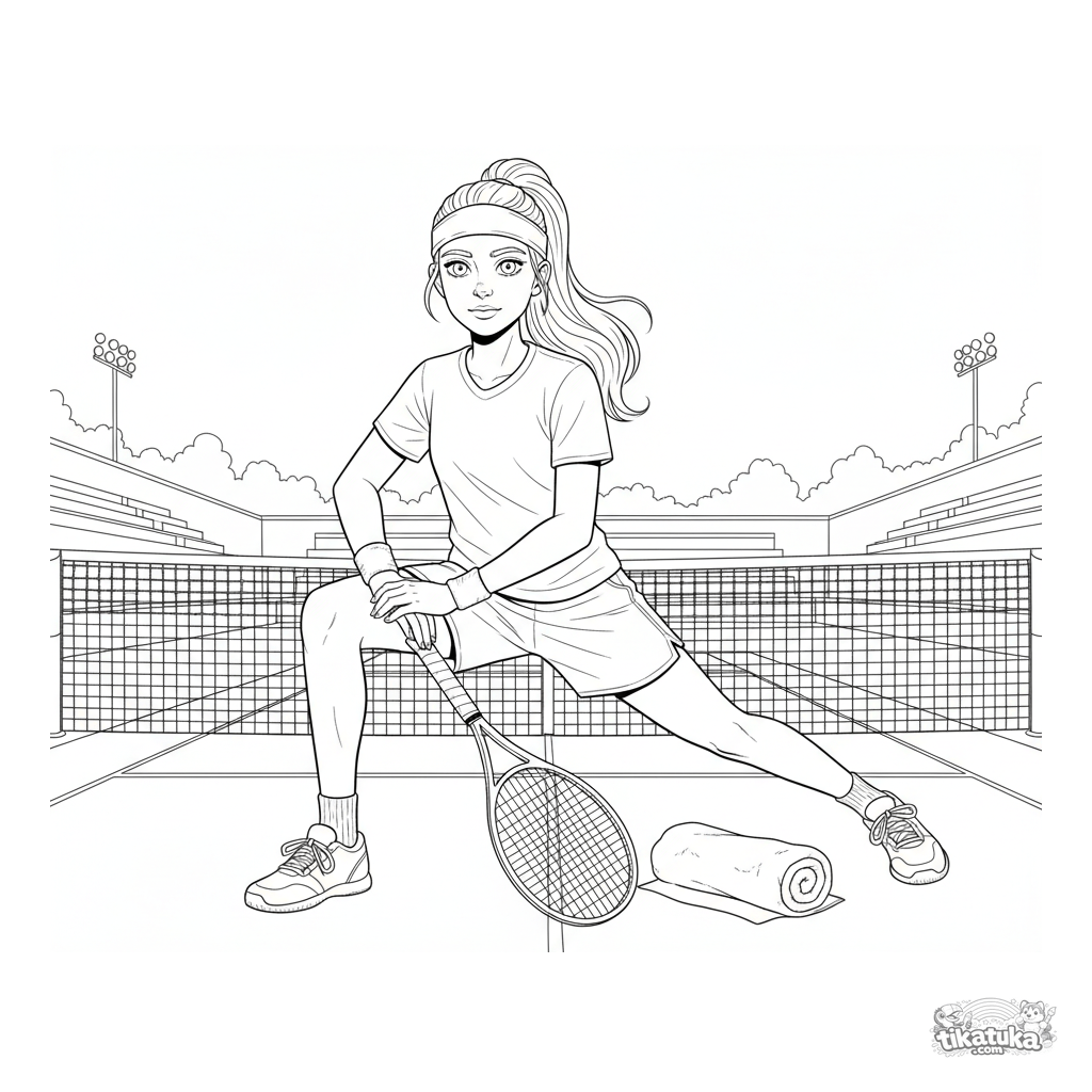 Detailed coloring page for kids 10-12: a teenage tennis player performing a stretch on the court before a match. Details include outfit, racket, towel, and court lines.