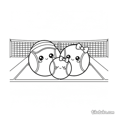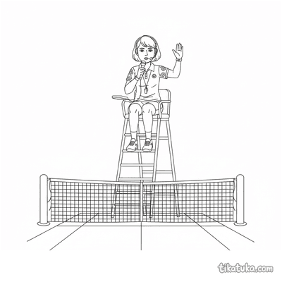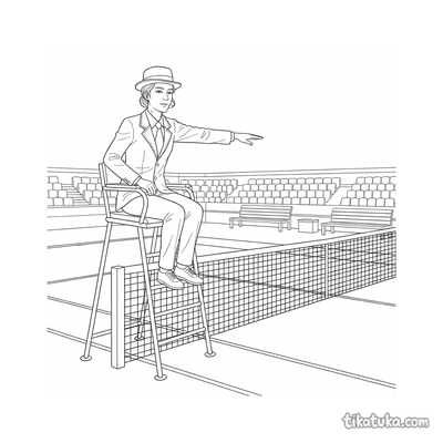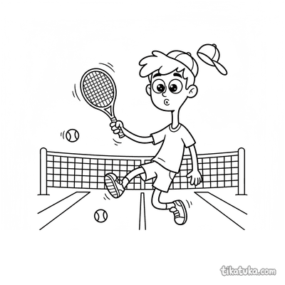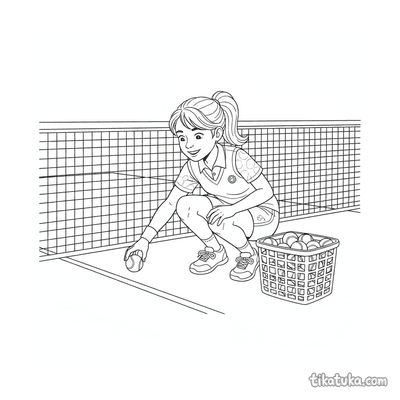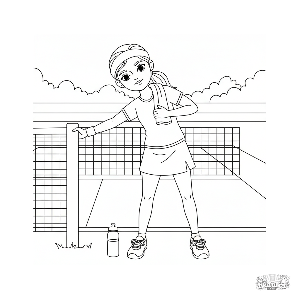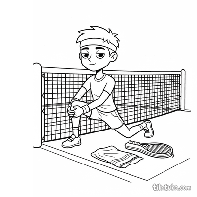Coloring page for tweens 7-9: a tennis player stretching at the net post on court. A calm scene with neat lines in a watercolor-sketch style.