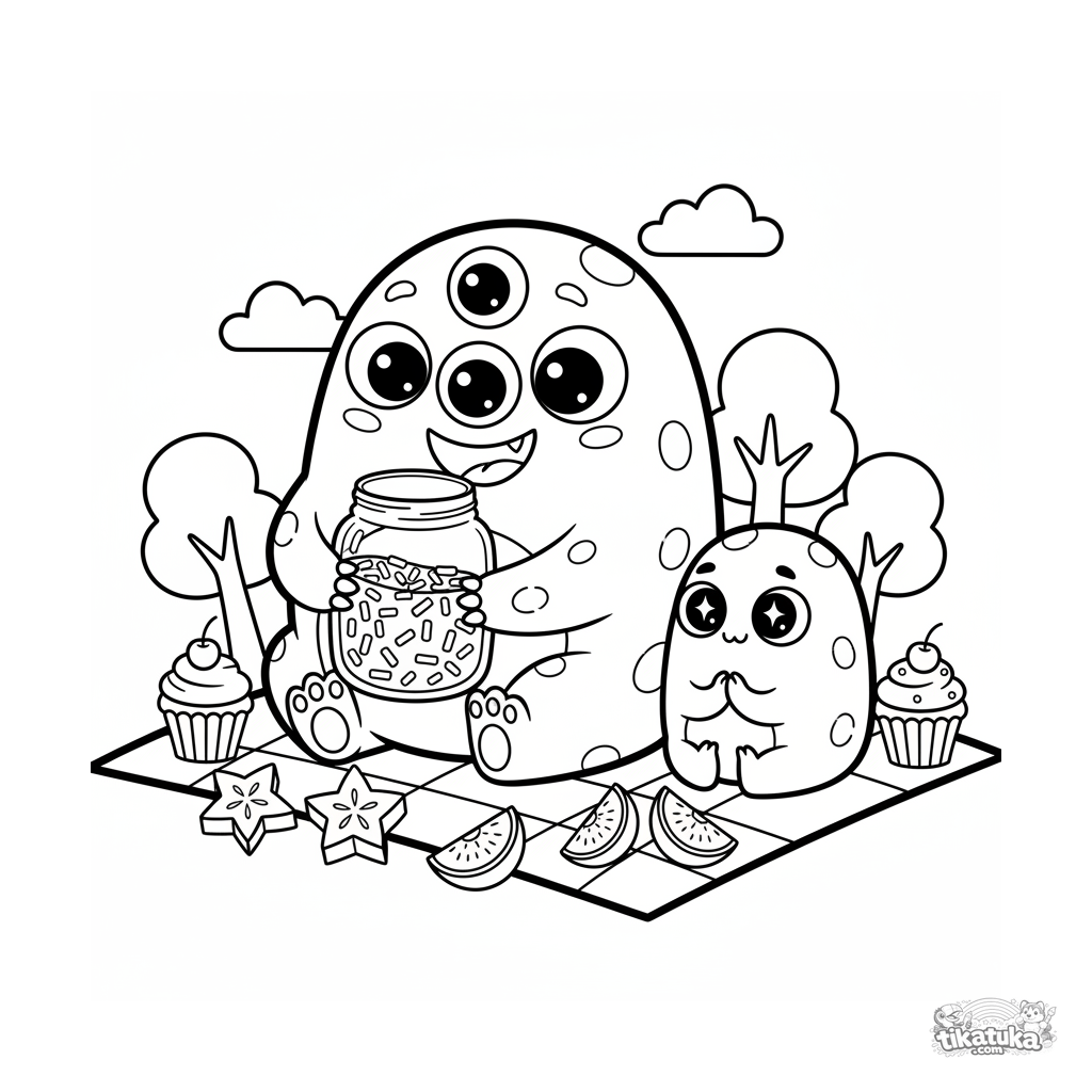 Coloring page of a three-eyed monster sharing a jar of sprinkles at a picnic. Cute friendship scene for kids 4-6 years old, with simple, clear outlines.