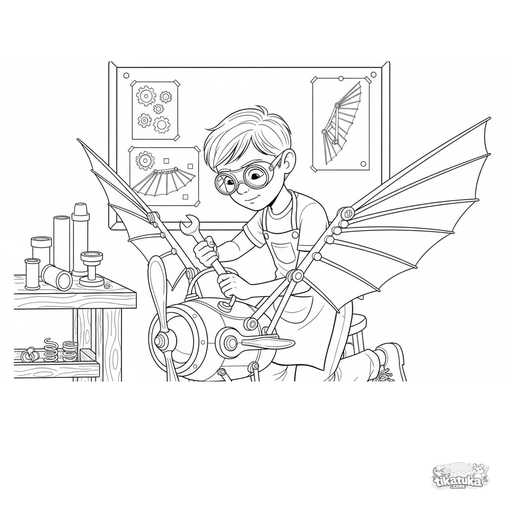 Coloring page for tweens 7-9: a young tinkerer in a secret laboratory repairs parts of his whimsical steampunk flying contraption.