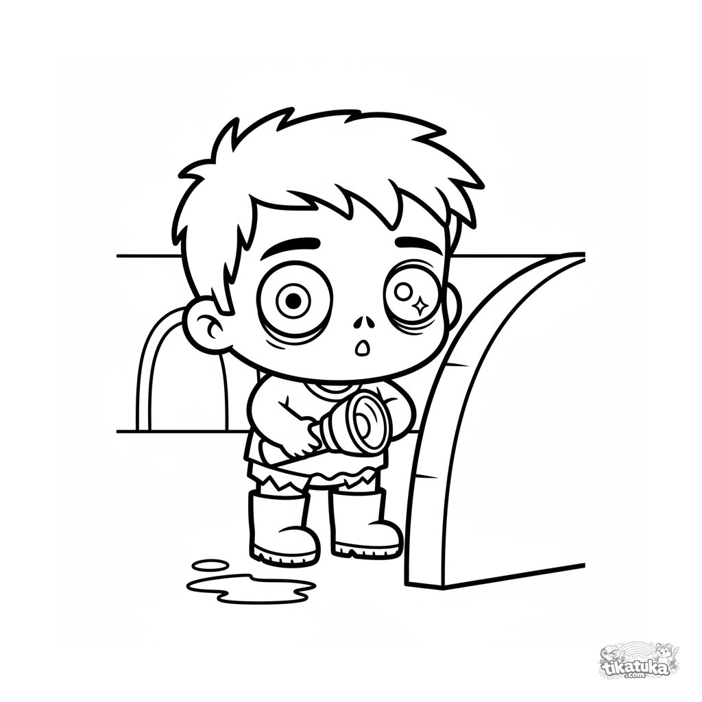 Coloring page for toddlers 2-3: a cute tiny zombie in big boots explores a sewer tunnel with a flashlight. Simple, large shapes.