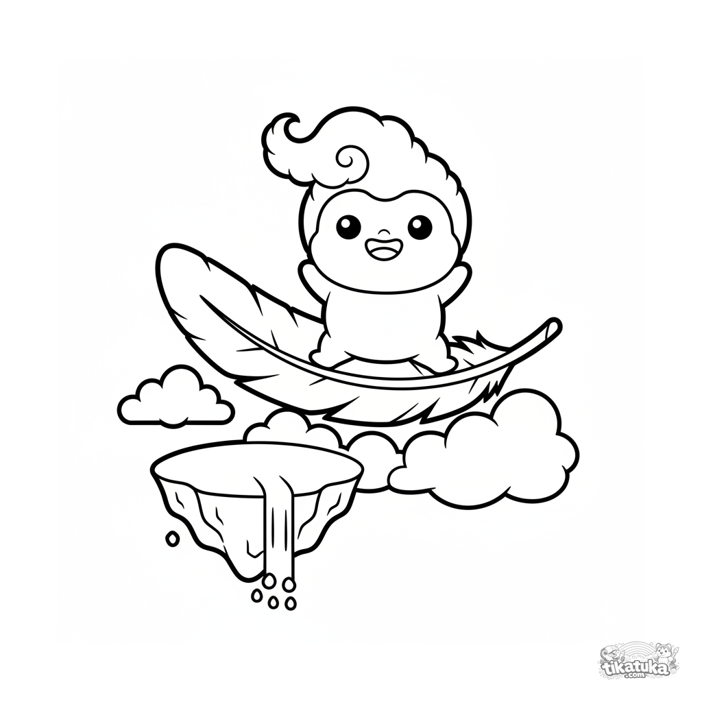 Simple coloring page for toddlers 2-3: a tiny cloud sprite rides a feather across the sky. Large simple shapes, wide margins for coloring.