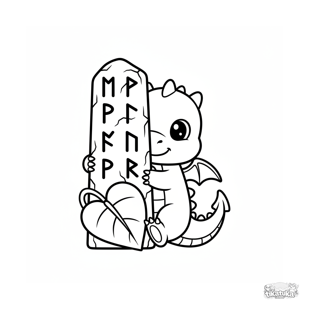 Coloring page for toddlers 2-3: a shy baby dragon plays peek-a-boo from behind an ancient rune pillar. Very simple shapes, large details, thick outlines.