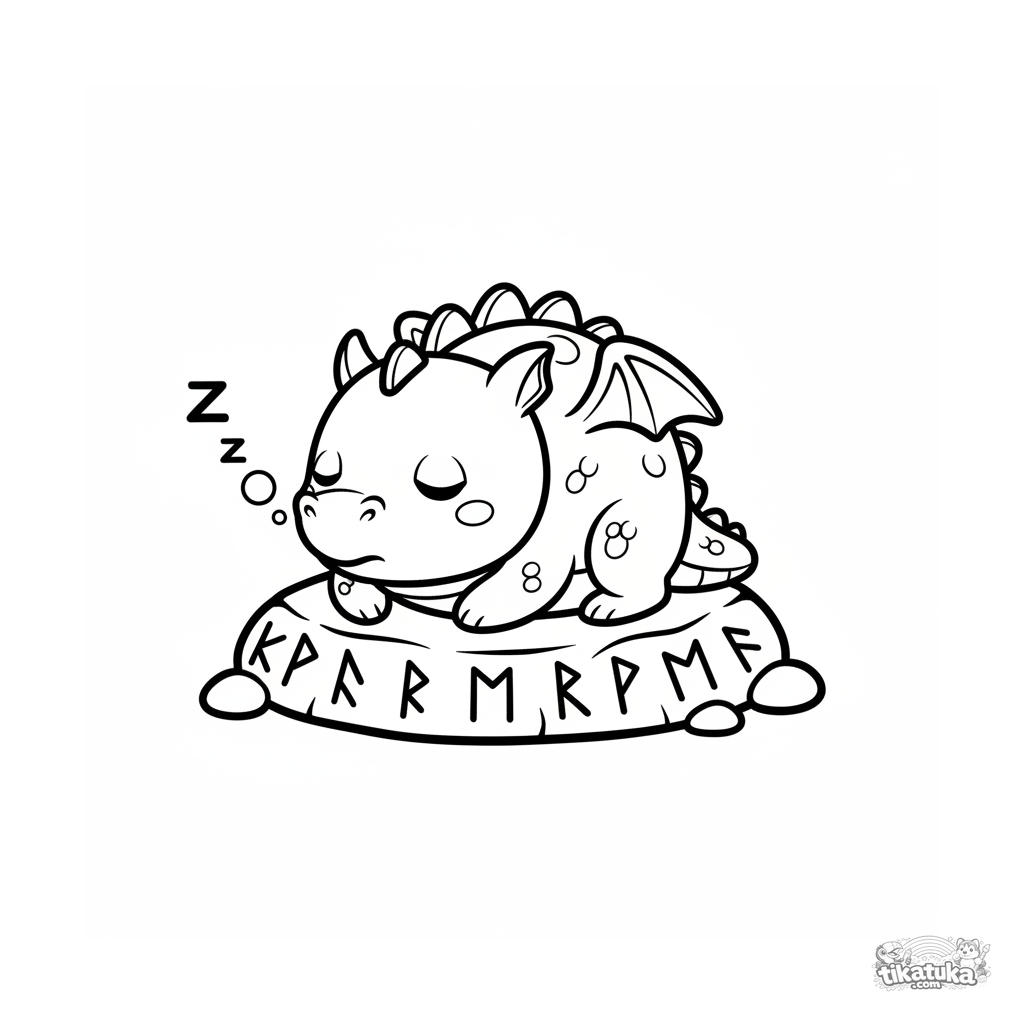 Simple coloring page for toddlers: a tiny dragon napping on an ancient rune stone. Large shapes, few details. For children 2-3 years old.