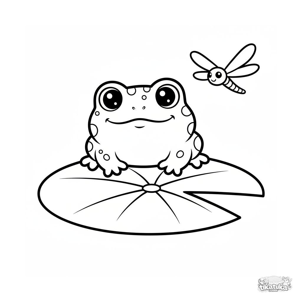 Simple coloring page for toddlers 2-3: a cute tiny frog sits on a lily pad by a stream bank, looking at its reflection in the water.
